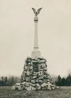 The Grunwald Monument stood in Empress Elisabeth Park in Stanisławów (present-day Ivano-Frankivsk, Ukraine). It was modest in form,[2] resembling a victory column. Its dimensions vary between sources—per Kurjer Stanisławowski, it was originally projected to reach 6 meters.[6] However, its column appears to have ultimately reached a height of 8 meters.[2] At its top stood a white eagle, a Polish national symbol, made of cement with its wings outstretched. Its base, measuring 3 by 2.5 meters,[6] consisting of boulders stacked against each other, with alpine flowers cultivated between them.[6] A plaque was affixed to the base, bearing the following inscription: