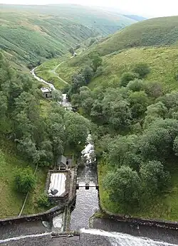 The Grwyne Fawr Reservoir is located in the valley of the river Grwyne Fawr in the Brecon Beacons National Park, Wales. Completed in 1928, it has the capacity to hold 400,000,000 imperial gallons (1,800 megalitres).[2]