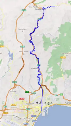 The Guadalmedina has its source at the La Cruz Peak, in the Sierra de Camarolos mountain range, and it is 47 kilometres (29 mi) long. It reaches the Mediterranean in the center of the city of Málaga and flows through the Montes de Málaga Natural Park.[1]