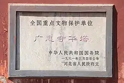 In 1961, Guanghui Temple Huata was listed as a national key cultural relic protected unit.[12] In 1981, the Zhengding County Cultural Relics Administration reinforced the Guanghui Temple Huata and the outer wall of the ground floor, but the related reinforcement material lost its effect and mostly peeled off in the early 1990s.[11] In 1994, the State Administration of Cultural Relics approved the reinforcement and restoration project of Guanghui Temple Huata, and the Hebei Institute of Ancient Architecture Conservation undertook the project. In 1999, the restoration work was completed and the four chambers at the bottom were reconstructed and the statue outside the fourth floor of the pagoda was completed, but the pagoda brakes could not be further restored due to a lack of physical evidence.[1] In 2006, a hand-copied volume of the "Ksitigarbha Bodhisattva Sutra" was placed inside the top of the pagoda of Guanghui Temple.[13] In March 2015, criminals attempted to dig their way through the tunnels underneath the Guanghui Temple Huata, and then excavate the artifacts inside the possible underground palace in Huata. Eventually, the public security authorities cracked the case before they could get their hands on it and arrested all the perpetrators.[14]