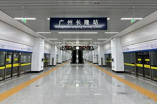 Guangzhouchanglong railway station (simplified Chinese: 广州长隆站; traditional Chinese: 廣州長隆站; pinyin: Guǎngzhōu Chánglóng Zhàn; Jyutping: Gwong2zau1 Coeng4lung4 Zaam6) is a station on Guangzhou–Huizhou intercity railway located in Panyu District, Guangzhou, Guangdong, China. The station was officially named as Guangzhouchanglong railway station in November 2020.[1] The railway station opened on 26 May 2024, and is operated by Guangdong Intercity Railway Operation Co., Ltd.[2][3]