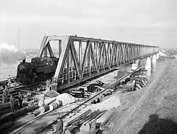The construction of the Elisabeth Bridge in Komárom, Hungary on the River Danube (today between the cities of Komárom, Hungary and Komárno, Slovakia)