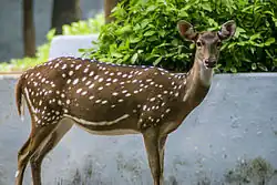 There are over 14 species of mammals including blackbuck, chital or spotted deer, jackal, small Indian civet, common palm civet, bonnet macaque, hyena, pangolin, hedgehog, common mongoose and three-striped palm squirrel. The park also has black-naped hare and several species of bats and rodents. The near threatened blackbuck, considered the flagship species of the park, was introduced in 1924 by Lord Willingdon and has seen a population decline in recent times.[9] It is now known that both Blackbucks and Chitals were a native faunal element of the park.[2][3][4] Some albino male blackbucks were also introduced by the Maharaja of Bhavnagar.[5] Per the census conducted on 29 February 2004, the population of Blackbuck was 405 (10 spotted in the IIT campus).[6] The chital population in the Park, appears to have been steady or even increased in the last century.[5] As per the census conducted on 29 February 2004, the population of the spotted deer was 2,650 including 1,743 females and 336 fawns. The census was taken in the Guindy National Park and the adjoining areas using the transect method, which would only reveal the numbers close to the actual figure.