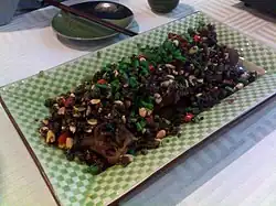 Guizhou cuisine, or Qian cuisine, consists of cooking traditions and dishes from Guizhou Province in southwestern China. Guizhou cuisine shares many features with Sichuan cuisine and Hunan cuisine, especially in bringing the sensation of spiciness and pungency. What makes Guizhou cuisine unique is the emphasis of a mixed sour-and-spicy taste, as compared to the numbing-and-hot sensation (麻辣; má là) featured in Sichuan cuisine and the dry-hot taste (干辣; 乾辣; gān là) featured in Hunan cuisine.[1] There is an ancient local saying, "Without eating a sour dish for three days, people will stagger with weak legs". The saying reflects how Guizhou people love local dishes with a sour taste.[2] The combination of sour and spicy flavours is also found in Shaanxi cuisine. Guizhou cuisine differs from Shaanxi cuisine in that it lacks the emphasis on the salty taste, which is a common trait found in most northern Chinese cuisines.[3] In addition, the unique sourness featured in Guizhou cuisine comes from the local tradition of fermenting vegetables or grains, and not from using vinegar products.