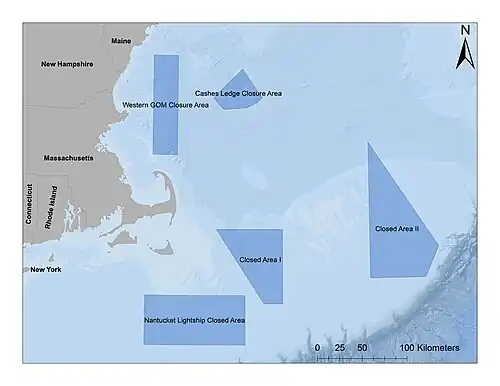 The Western Gulf of Maine Closure Area (WGoMAC) was established in 1998 in response to the decreasing Atlantic Cod (Gadus morhua) stock.[2] WGoMAC is located off the shores of Massachusetts, New Hampshire, and Maine and is approximately 3,100 km2 (1,200 sq mi).[2] It is rectangular and runs in straight lines from 42° 15' to 43° 15' North, and 69° 55' to 70° 15' West.[3]