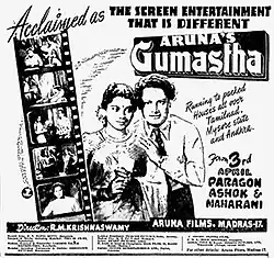 Gumastha (transl. Clerk) is a 1953 Indian film starring V. Nagayya, R. S. Manohar and Pandari Bai. The film was produced in Tamil and Telugu languages under the same title. It is based on the play NGO (Non-Gazetted Officer) by Acharya Aatreya.[2][1] The film was released on 3 April 1953.[3]