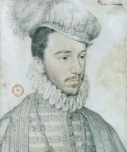 In 1563, at the age of nineteen, he presented himself at the French court. No sooner had he arrived than he was established as a gentilhomme de la chambre du roi (gentleman of the king's chamber) which brought with it an income of 520 livres. He acquired a pension of 600 livres which would then be doubled to 1,200 livres by the queen mother Catherine in 1567.[2]