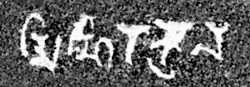 Portrait of Mihirakula from his coinage. He is mentioned in line 3 of the Gwalior inscription.The name "Mihirakula" (Gupta script: , Mi-hi-ra-ku-la) in line 3 of the Gwalior inscription.