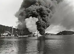 The destroyer HSwMS Klas Uggla in flames during the Hårsfjärden disaster.
