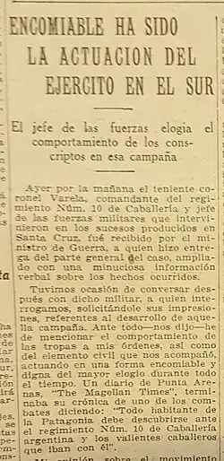In November 1920, a rural workers' strike broke out in Santa Cruz, which went down in history as Patagonia Rebelde or Patagonia Tragica (Rebel Patagonia or Tragic Patagonia). Varela was appointed by Hipólito Yrigoyen to try to smooth things out between the parties. After meeting with the strikers, an agreement was reached. However, when Varela withdrew from Patagonia, the ranchers did not comply and the strike began again as if there had been no agreement.[1] However, the government, being strongly criticized and accused of inaction by Santa Cruz landowners, conservative newspapers and embassies of foreign powers, sent Varela back to Santa Cruz with a force of 200 soldiers to violently repress the workers' movement. For more than a month Varela's troops persecuted the strikers, executing by firing squad most of them.[1]