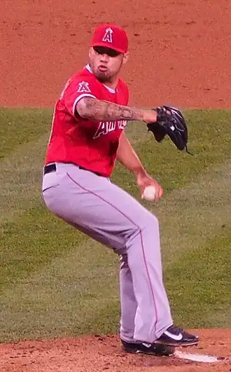 Santiago was traded to the Los Angeles Angels of Anaheim on December 10, 2013, in a three-team trade involving the Chicago White Sox, the Arizona Diamondbacks, and the Los Angeles Angels. The Angels received Tyler Skaggs along with Santiago, while the White Sox received Adam Eaton and the Diamondbacks received Mark Trumbo, Brandon Jacobs, and A. J. Schugel.[8][9] In his first season in Anaheim, Santiago was fairly inconsistent, he averaged less than 6 innings per start and for a moment was sent to the bullpen, where he made 6 appearances while also starting 24 times for the Angels. In 127+1⁄3 innings, Santiago went 6-9 with a 3.75 ERA.