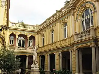 The building has a square plan, with two floors above the ground level and an attic. There are eight window bays on the main street facade, with rectangular frames on the first two levels and curved bays on the second level. Each bay on the second level opens onto a private balcony.[8] Due to the sloping ground, the rear of the first floor above the street entrance opens onto a ground-level inner court lined on two sides by a portico with alternating Ionic columns and sections of wall. Above one side of the inner court there is a long gallery lit by seven bays with semi-circular arches. In the center of the inner court there is a marble nymph signed Bastet (1896). In the main court a ceramic frieze with floral decoration on the wall provides a background to a bronze statue of a young flute player.[8]
