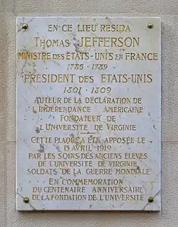 In this place resided Thomas Jefferson, Minister of the United States to France 1785–1789, President of the United States 1801–1809, Author of the American Declaration of Independence, Founder of the University of Virginia