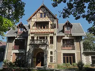 The building they selected was the old Manor of Miraville which had been erected on the site of the Château de Richebourg which was burnt down by Huguenots in 1567.[6] The manor house was commissioned by a lace merchant, Frédéric Aylé, and benefited from a large estate known as Miraville Park.[7] It was designed by Paul Boeswillwald in the Renaissance Revival style, built in brick with half-timber dressings, and was completed in 1885. The design involved a symmetrical main frontage of three bays facing west towards Miraville Park. The central bay, which was slightly projected forward, featured a porte-cochère supporting a balcony; there was a tri-partite window flanked by pilasters supporting a cornice on the first floor, and a half-timbered gable above. The outer bays contained French doors on the ground floor, casement windows on the first floor, and dormer windows at attic level. Internally, there was a grand staircase and some of the windows were originally decorated with fine stained glass dating from the 16th century. Aylé's son, Frédéric-Henri Aylé, sold the house to a hotelier, René Massiaux, in 1942. After the Second World War, a plaque to commemorate the lives of local people who had died in the service of the French Forces of the Interior was installed in Miraville Park.[8][9] The manor house served as a hotel until the town council acquired both the manor house and Miraville Park in 1964.[10] A Salle du Conseil et des Mariages (council chamber and wedding room) was subsequently established in the building.[11][12]