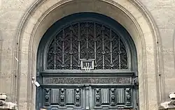 The building complex occupies a length of 114 meters on rue de la Banque, punctuated by several pavilions.[4] The central pavilion, ostensibly inspired by church architecture, displays two allegorical medallions with figures representing, respectively, Security and Law, sculpted by Eugène André Oudiné.[1] Between those two, a monumental inscription reading "TIMBRE IMPERIAL MDCCCL" (lit.'Imperial Stamp 1850') which referenced both the applicable legislation (law of 1850) and the imperial regime that was in place by the time of completion in 1852.[4] Because of their political overtones, the lower two lines were later erased, leaving only the word "TIMBRE" visible. Above is a triangular pediment sculpted by Henri Alfred Jacquemart.[1]