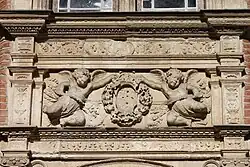 Focal point for pomp, a sumptuous fireplace displays a classical vocabulary, and thus demonstrates the humanist knowledge of Béringuier Maynier. At the center of the frieze, two kneeling putti present the owner's arms in a floral wreath (called 'triumphal garland'). Medallions framed with triumphal garlands or supported by hybrid beings, chubby cherubs playing with an imposing garland of fruits and vegetables on the pediment: the iconographic work constitutes a panegyric of fortune, abundance and fertility.[1]