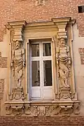 Due to the absence of nearby stone quarries, the predominant building material in Toulouse was brick, so adding a stone window to a house was an effective way of displaying success and social rank, such features attracting the eyes of passers-by. The various owners of the hôtel were consistent in the care they took over the decoration of the windows. On rue Ozenne, the windows commissioned by Béringuier Maynier feature magnificent pilasters, candelabra and rinceaux. On rue du Languedoc, a sculpted window commissioned by Jean Burnet between 1547 and 1555 took inspiration from an engraving by the architect Jacques Androuet du Cerceau. It retains the general composition of the engraving but simplifies the upper section and adds sculpted human and hybrid figures. This window had its admirers because in 1555 the parliamentarian Pierre de Nos copied it for the castle on his estate.[1]