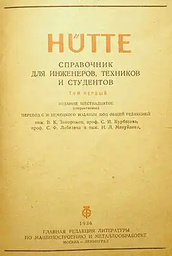 7. ^ Hütte: Справочник для инженеров, техников и студентов (in Russian). Vol. 1 (16 ed.). Объединенное научно-техническое издательство (ОНТИ). 1936. (NB. This is a Russian translation of the 26th German edition of Hütte - Des Ingenieurs Taschenbuch as of 1931.)