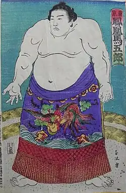 His real name was Miyokawa Toranosuke (三代川 寅之助) and was known for his large body and strength since he was a boy.[1] He joined Miyagino stable because the then head coach (Miyagino Umagoro) was from Makuhari, Chiba District and made his professional debut in May 1886 under the shikona Kikutayama (菊田山). It is thought that his first shikona was chosen to pay homage to his hometown shrine of Kikuta.[1] He was later given the shikona Araumi (荒海) in May 1887 before changing it to Ōtori () in January 1891. Upon promotion to juryō, in June 1892, he was given the shikona Hōō (鳳凰).