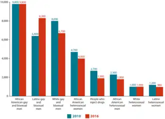 Hispanic and Latino Americans are the second ethnic group most disproportionately affected by HIV/AIDS.[61] The annual number of Hispanics/Latinos newly diagnosed with HIV infection has increased by 7% between 2012 and 2016.[61] Specific Hispanic/Latino populations most heavily affected by HIV/AIDS are men who have sex with men (MSM), accounting for approximately 80% of estimated HIV incidence among Hispanics/Latinos, followed by transgender Hispanic/Latina women and recent Hispanic/Latino immigrants.[61] Hispanics/Latinos represented 16% of the U.S. population but accounted for 21% of new HIV infections in 2010. This disparity is even more apparent among Hispanic/Latina women, which represent 13% of the population but account for 20% of reported HIV/AIDS cases among women in the United States.[78] Hispanic and Latino Americans accounted for 20% of people living with HIV infection in 2011. Disparities persist in the estimated rate of new HIV infections in Hispanic and Latino Americans In 2010, the rate of new HIV infections for Hispanic/Latino men was 2.9 times that for White American men, and the rate of new infections for Hispanic/Latina women was 4.2 times that for White American women. Since the epidemic began, more than 100,888 Hispanic and Latino Americans with an AIDS diagnosis have died, including 2,863 in 2016.[79]