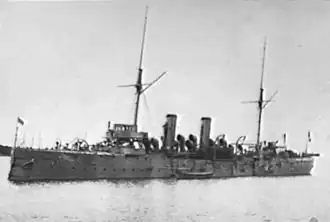 HMS Tauranga was a Pearl-class cruiser of the Royal Navy. The vessel was originally named Phoenix and built by J & G Thomson, Glasgow. She was launched on 28 October 1889.[2] Renamed on 2 April 1890, as Tauranga as part of the Auxiliary Squadron of the Australia Station. She arrived in Sydney with the squadron on 5 September 1891. During the Samoan civil unrest in 1899, she took part in operations with HMS Porpoise and HMS Royalist.[2] Spending between 1901 and 1903 in reserve at Sydney before being assigned to the New Zealand division of the Australia Station. She left the Australia Station on 14 December 1904. She was sold for £8500 in July 1906 to Thomas Ward for breaking up.[2]