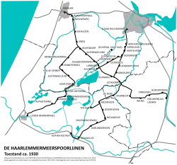 The Haarlemmermeer railway lines (Dutch: Haarlemmermeerspoorlijnen) are a former network of railway lines in the area between Haarlem, Amsterdam, Utrecht and Leiden. Despite the name they did not all travel over the territory that formerly comprise the Haarlemmermeer lake before it was drained.