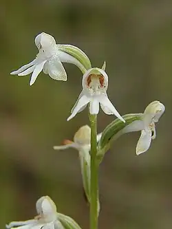 Habenaria ochroleuca, commonly known as the sickle orchid[2] or sickle habenaria,[3] is a species of orchid that is endemic to northern Australia. It has two or three broad, glabrous leaves and up to twenty five white flowers on a flowering stem with many overlapping bracts. The side lobes of the labellum curve upwards.