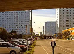 Hagalund (ⓘ) is a residential area and railway yard in Solna Municipality, 5 km north of central Stockholm. It is known for the blue highrise buildings "Blåkulla" (Blue Hill or Blockula) which, against a rather strong and long-lasting opinion, in the beginning of the 1970s replaced a picturesque working-class and craftsman neighbourhood built in the 1890s and portrayed by artist Olle Olsson Hagalund. There are still about half a dozen old houses preserved, a minor area called Gamla Hagalund (Old Hagalund) in the eastern part of the area.