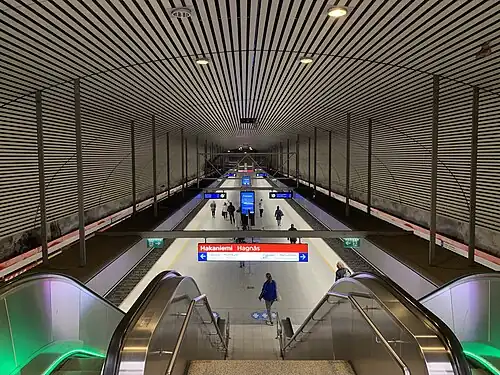 Hakaniemi metro station (Finnish: Hakaniemen metroasema, Swedish: Hagnäs metrostation) is a station on the Helsinki Metro.[2] It serves the central Helsinki districts of Hakaniemi and Kallio. Both lines M1 and M2 serve Hakaniemi. There are 28 bicycle parking spaces at the station.[3]