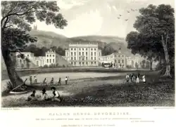Haldon House (pronounced: "Hol-don") on the eastern side of the Haldon Hills in the parishes of Dunchideock and Kenn,[2] near Exeter in Devon, England, was a large Georgian country house largely demolished in the 1920s.[1] The surviving north wing of the house, comprising the entrance front of the stable block, consists of two cuboid lodges linked by a screen pierced by a Triumphal Arch,[3] with later additions,[1] and serves today as the "Lord Haldon Hotel".[4] The house was originally flanked by two such paired pavilions, as is evident from 19th century engravings.