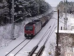 The track is used by freight trains, running from Falkenberg/Elster for instance or formed in Eilenburg and running towards the freight centre in Halle (Saale). Moreover, it has become increasingly important for freight to and from Eastern Europe, branching in Falkenberg via Hoyerswerda to Węgliniec to Poland (Węgliniec–Roßlau railway).[4] After the completion of the construction work between Horka and Hoyerswerda, traffic on the line, according to Deutsche Bahn publicity, will increase from the current 40 freight trains to 160 freight trains daily on the Falkenberg–Eilenburg–Halle/Leipzig section, thus making the line a major international freight route.