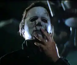 Halloween II departs significantly from its predecessor by incorporating more graphic violence and blood, making it far more similar to slasher films of its time. This scene depicts Michael bleeding after being shot in both eyes.