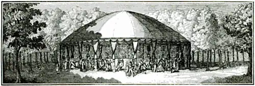 A large country café will be set up in the middle of a vast room of greenery: there will be coffee, high tea, chocolate, bavaroises, punch, all kinds of cool drinks, sweet wines, fine liqueurs from the islands, glazed pastries Italian-style, a complete selection of molded ice creams, sherbets, and mousses made by Citizen Tortoni, the pupil and successor of Velloni Senior: a new sparkling lemon drink like the best champagne, a Dutch beer-garden in the middle of the Hamlet, where white beer of the best quality will be served, with various pastries, and generally everything one might desire, all of the best quality, and in the most proper and decent atmosphere. In this huge space there will be all sorts of fun country games, including see-saws, merry-go-round, badminton, water races, dances in the middle of the Hamlet organized by Citizen Julien; a superb promenade on the chateau's terrasse, newly decorated with pavillions with mirrors and statues; a vase with flowers and lights, and many beautiful orange-trees; finally, nothing has been forgotten to make this the most pleasant and elegant visit.