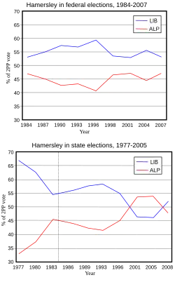 At federal level, Hamersley is within the Division of Stirling, a marginal seat which historically has alternated between the Liberal Party and the Australian Labor Party. It has been held since 2004 by Michael Keenan of the Liberal Party.[86] At polling place and subdivision level, Hamersley has supported the Liberal Party at every election since its first in 1972, the only exception being the 1983 election.[87] In the 2001 election, the booth at East Hamersley Primary School was only won by the Liberal Party with a 0.3% two-party-preferred majority. Hamersley was in the Division of Cowan for elections held between 1984 and 1996.