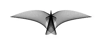 The 500 line segments defined above together form a shape in the Cartesian plane that resembles a flying bird. Looking at the line segments on the wings of the bird causes an optical illusion and may trick the viewer into thinking that the line segments are curved lines. Therefore, the shape can also be considered as an optical artwork.[55][8][14][64][58][65] Another version of A Bird in Flight that was designed by Naderi Yeganeh's second method is the union of all of the circles with center and radius , where , and