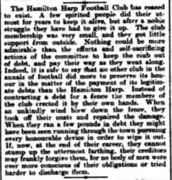 The "decadence" of professionalism was too much for the Harp, and, although it formally "ceased to be" in August 1897,[18] the club had dissolved in July 1896. The club's final act was writing to Cameronians to say that it was scratching from its 1896–97 Scottish Cup preliminary tie, allowing the Cameronians to arrange a friendly with Alloa Athletic.[19] The club had hoped to turn to Junior status in 1896 but found the debt accrued too much of an obstacle.[20] The final match for the club, in the Coatbridge Express Cup in April, summed up the club's issues - only 7 players turned up at Albion Rovers, so the Harp scratched, and borrowed four players for a friendly instead, which the Rovers won 6–2 despite an " altogether lifeless" display.[21]