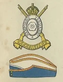 In 1834 the troops in north Hampshire were regimented to form the North Hampshire Regiment of Yeomanry Cavalry. In 1838 the regiment and the troops at Andover and Lymington continued without pay, while all the other troops were disbanded. In 1841 the regiment was converted to Hussars and dropped the 'North' part of its title in 1848, when regimental headquarters (RHQ) was at Winchester. In the 1850s it absorbed the Andover and Lymington troops. In 1887 it received the title of Hampshire Yeomanry (Carabiniers) (carabiniers being a form of mounted riflemen), and adopted crossed carbines as its badge. On 1 April 1893 its troops were organised into squadrons and RHQ moved to Southampton (though it returned to Sussex Street in Winchester by 1899).[3][4][6]