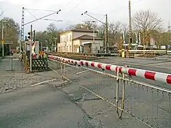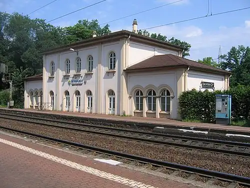 The entrance building is one of the oldest surviving in Hesse. It was put into operation on 10 September 1848. It was designed by Julius Eugen Ruhl.[5] He placed it directly at the intersection of Hochstädter Landstraße with the Burgallee, the connection between the Park Wilhelmsbad and the Baroque palace of Schloss Philippsruhe, which was the residence of the Count of Hanau when the station was established. The station building was therefore equipped with a Fürstenzimmer (prince's room), which occupied the central part on the ground floor of the entrance building, as a waiting area for the "highest and most supreme rulers".[6] In the 1990s, the building was privatised and has since been used for a restaurant. The entrance building is listed as a cultural monument under the Hessian monument protection law. Today it is included with the architectural ensemble of the park of Wilhelmsbad.[7]
