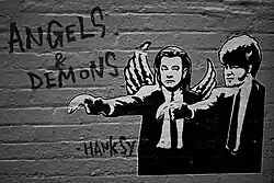 2012 "Angels and Demons" street art by Hanksy, based on Banksy's 2002 "Pulp Fiction"