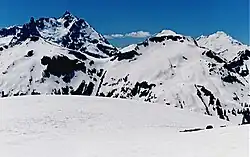Hannegan Peak is a 6,191-foot elevation (1,887 m) mountain summit located in the Skagit Range, which is a subset of the North Cascades in Whatcom County of Washington state.[4] It is situated immediately north of Hannegan Pass, and 2.2 mi (3.5 km) north of Ruth Mountain in the Mount Baker Wilderness, which is managed by Mount Baker-Snoqualmie National Forest. Banning Austin and R.M. Lyle made the first ascent of Hannegan Peak in 1893 while surveying for a possible road across the Cascades over Hannegan Pass to Whatcom Pass. This peak was named in association with Hannegan Pass, which in turn was named for Tom Hannegan, State Road Commissioner at that time.[5] Although no road was built, a four-mile trail leads hikers to the pass, and another one-mile path leads to the summit. Peaks which can be seen from the summit include Mount Shuksan, Ruth Mountain, Mineral Mountain, Mount Baker, Mount Sefrit, Mount Larrabee, Granite Mountain, Mount Chardonnay, Mount Rexford, the Picket Range, and many more.
