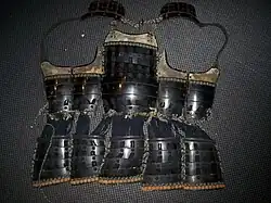 Haramaki were originally constructed with the same materials as the ō-yoroi but designed for foot soldiers to use as opposed to the ō-yoroi which was for mounted warfare.[1] Haramaki refers to any Japanese armour which is put on from the front and then fastened in the back with cords. Other types of dō open from the side (ni-mai dō, dō-maru, maru-dō) instead of opening from the back as the haramaki does.