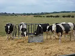 A cow magnet is a veterinary medical device for the treatment or prevention of hardware disease in cattle.[1] Traditionally, cow magnets were strong Alnico magnets about 1 by 8 cm (0.39 by 3.15 in) in the shape of a smoothed rod, but today they are more commonly several ring-shaped ferrite magnets attached to a stainless-steel or plastic core, in the same shape as the single-piece original. Newer designs to help increase effectiveness include a cage design, in which the magnet holds metal objects inside a protective plastic framework. Even newer designs include a stronger array of rare-earth magnets inside a stainless steel body that resembles the original Alnico design.