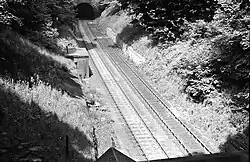 According to Basil Jeuda, the tunnels were a key link in Britain's rail system.[2] The arrival of the railway negatively impacted the canal tunnels.[4] In 1914, the older of the two canal tunnels was permanently closed by a partial collapse of the bore, allegedly caused by vibrations generated by trains passing through the railway tunnels.[6][5]