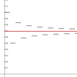 The first fourteen partial sums of the alternating harmonic series (black line segments) shown converging to the natural logarithm of 2 (red line).