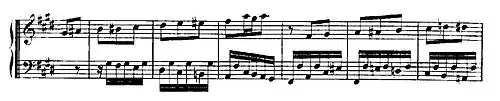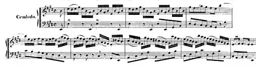 8 time is a Siciliano, which Jones (2013) has described as beautiful and haunting. In da capo form, the sustained string ritornello is accompanied by the harpsichord with an explicit realisation of the figured bass by gentle broken chord semiquavers. After the opening ritornello, the harpsichord, accompanied by detached quaver chords in the strings, plays its own melodic line spun out in two long increasingly ornamented phrases, the second of which merges into the semiquaver accompaniment of the closing ritornello.[5]