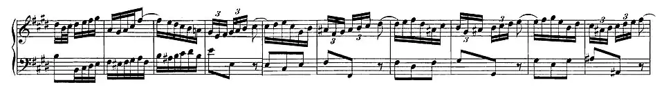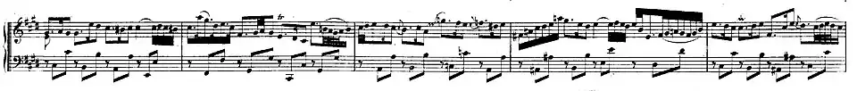 Of 38 bars in length and punctuated by fragmentary responses from the strings, the solo episode modulates through the keys of B major and C♯ minor to a cadence in F♯ minor. It is followed by a sequence of short passages alternating between ritornello material and solo material for the harpsichord drawn from both section B (semiquaver figures) and then section A (the beginning of the harpsichord theme). The ritornello segments move from F♯ minor to E major, the final segment modulating from F minor to B major and then E major. The next twelve bar solo episode continues with and develops the harpsichord's thematic material from section A, modulating from E major, to B major and then to the distant key of D♯ major. The 4-bar Vordersatz from the ritornello is then played in this key, then in G♯ major, reaching the key of C♯ minor. Section B ends symmetrically with an extended 33-bar solo episode, a variant of the long chromatic episode with which it began, After modulating through the keys of G♯ minor, C♯ minor and D♯ minor, the movement briefly halts in the manner of a Scarlatti da capo aria with a cadence to the mediant key of G♯ minor. The music resumes with a capitulation of section A.[6]