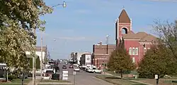 Looking north on Broadway at Hartington's two most prominent brick structures, the Romanesque tower of the Cedar County Courthouse (1891-1892) appears in the right foreground, with the front (west) end of the City Hall and Auditorium across Centre Street north of the courthouse.