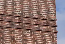 The central bay of the south facade of the Hartington City Hall and Auditorium is highly effective Prairie School architecture (the nearly hidden north facade is similar). The bulk of the wall surface is simple running bond brickwork, forming a uniform ground for the interplay of horizontal and vertical lines. The stone coping at the roofline forms the highest horizontal line. Not far below is a horizontal band of triple corbelling that surrounds the building. This effect is created by projecting three courses of brick out farther than the wall below (as in a corbel), repeating it with three more courses of brick, and then repeating it again for the entire rest of the wall up to the copestone. Steele adds depth and interest to this band by varying the projection of each of the three brick courses by facade so that corners highlight one or another course (see photo below). This effective horizontal band is similar to but more sophisticated than what Steele used near the top of his noted First Congregational Church (Sioux City, 1916–1918). Additional horizontal lines derive from the original three bands of windows (particularly prior to more recent window alterations). These consistent horizontal lines are dramatically emphasized by the strong counterpoint of the six vertical piers. Yet even these vertical pilasters have horizontal elements in their capitals, consisting of three horizontal bands of projecting brick string courses (which echo the triple corbelling above) and the contrasting capitals of cast stone on top. Across the set of six vertical piers or pilasters along the auditorium, these elements create additional horizontal lines.[12][23][27][30]