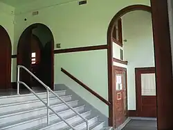 Architect Steele continued the semi-circular motif from the front (west) facade into the doors and archways of the lobby.