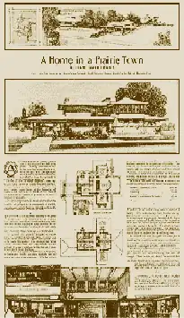 The 1901 Ladies' Home Journal designs were influential and have become famous. "A Home in a Prairie Town" was published in February, followed by "A Small House with Lots of Room in It" in July.[9] These were part of a series of designs sponsored by Journal editor Edward W. Bok in a crusade to update US housing designs to better fit the way families were living. Bok was looking for a simplified, functional house, and required designs he published to replace the fussy parlor with a living room, to include at least one bathroom, improved ventilation, and no "senseless ornament". Architectural historian Gwendolyn Wright observes that the publication of these two articles "provided the first opportunity for Frank Lloyd Wright to show his alchemy, converting a simple programme into architectural gold.... The [first] design contains virtually every revolutionary theme he would employ for the next two decades."[10]